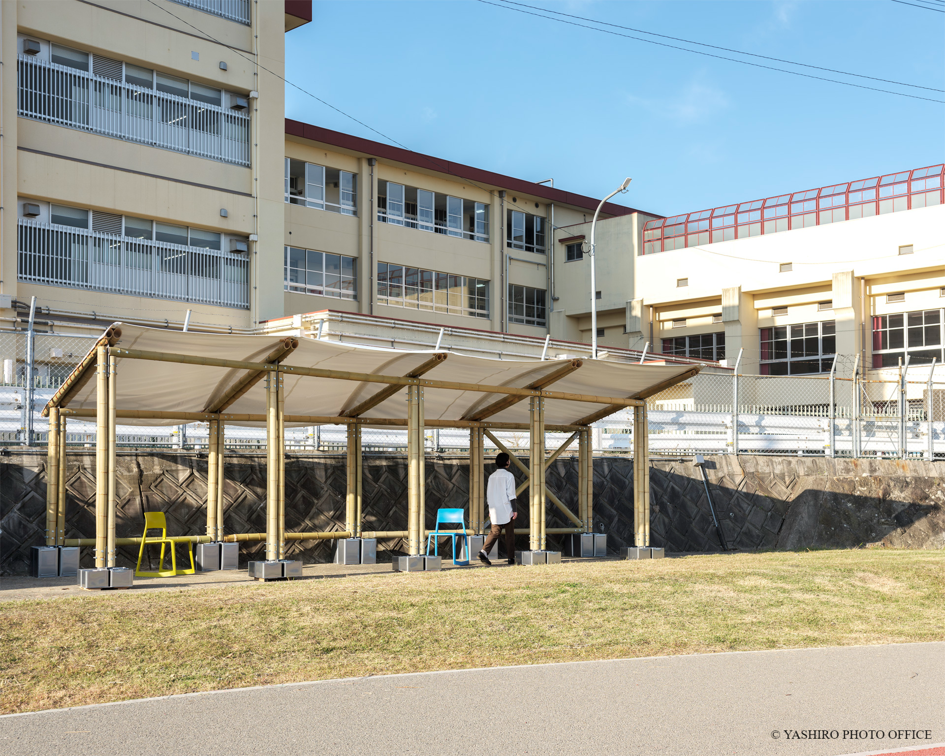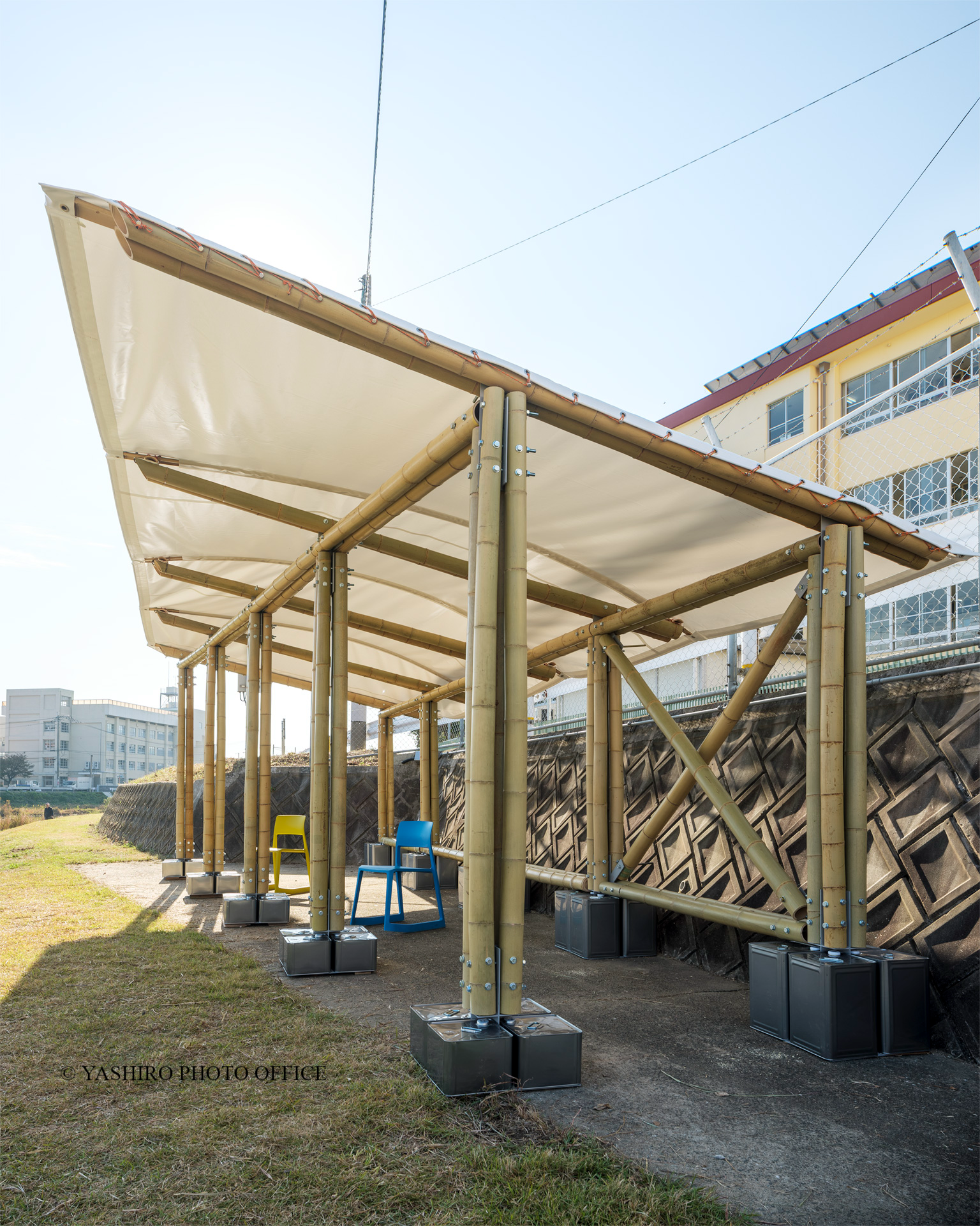 ベーシックな柱梁構造を竹でつくる試みであり、単純な構造形式と膜形状を組み合わせることで、「軽量性」と「柔軟性」という双方の特性を親和させています。小学生の総合学習の場として活用され、サーキュラーデザインを学ぶ機会を提供しました。