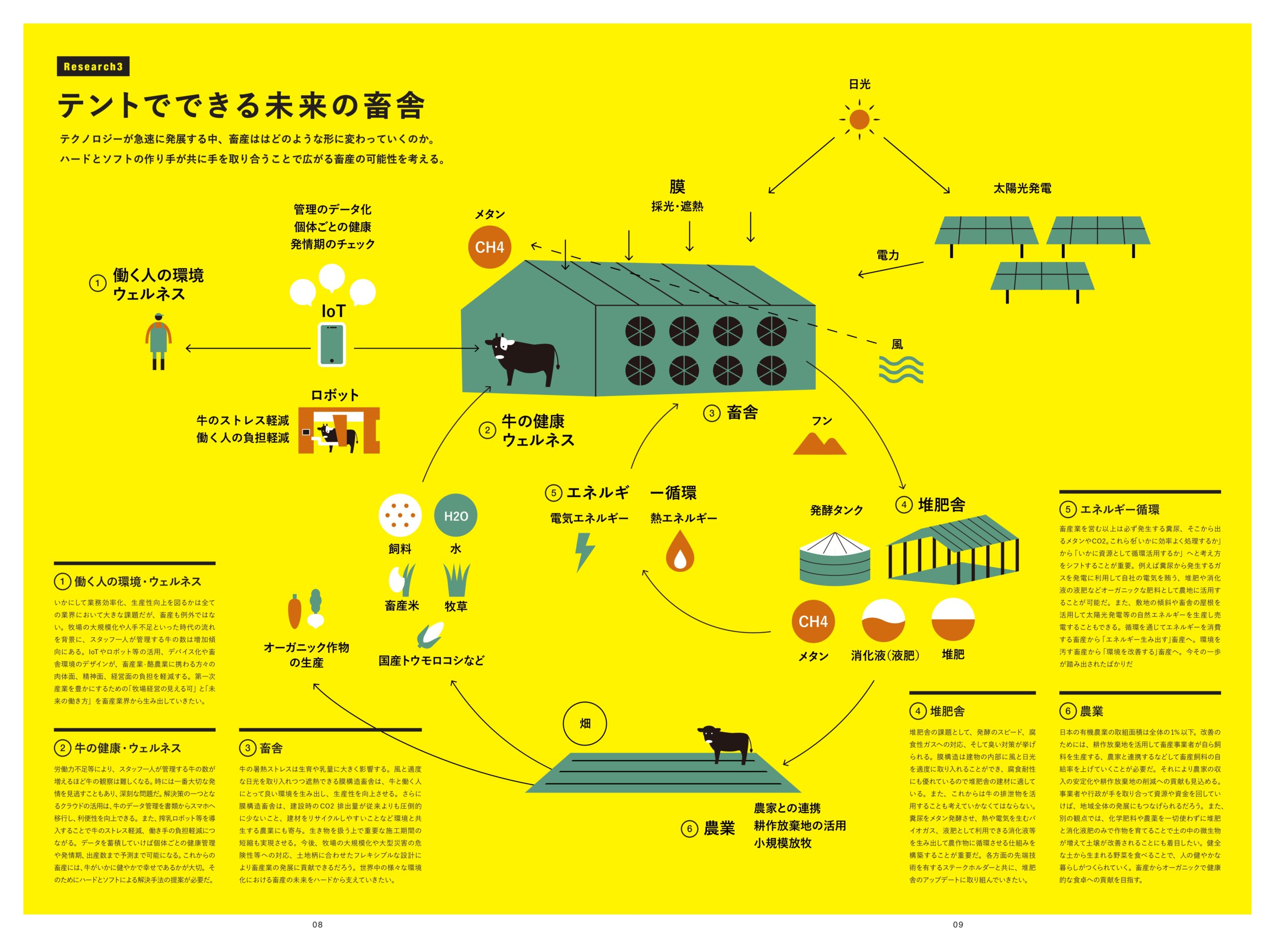 市場成長が著しい探索領域である畜産・養殖用途について、中央畜産会へインタビューを行うなどリサーチを実施しています。膜構造畜舎は、断熱性・通気性を自在にコントロールできる環境制御型の新しい一次産業インフラとなり得ると構想されており、メタンガスホルダーによるエネルギー循環などを活用した未来の畜産業が追求されています。詳細はコチラ