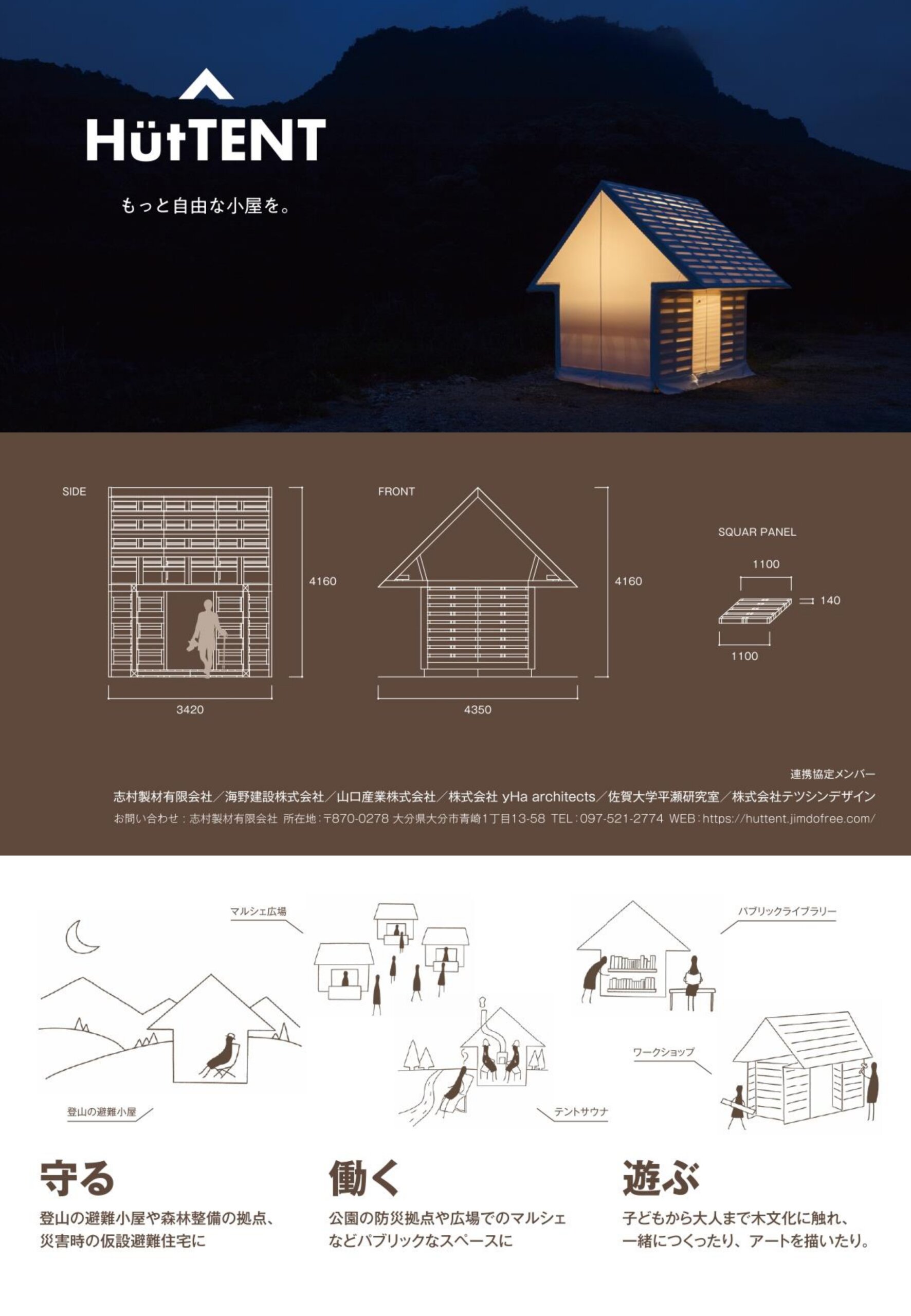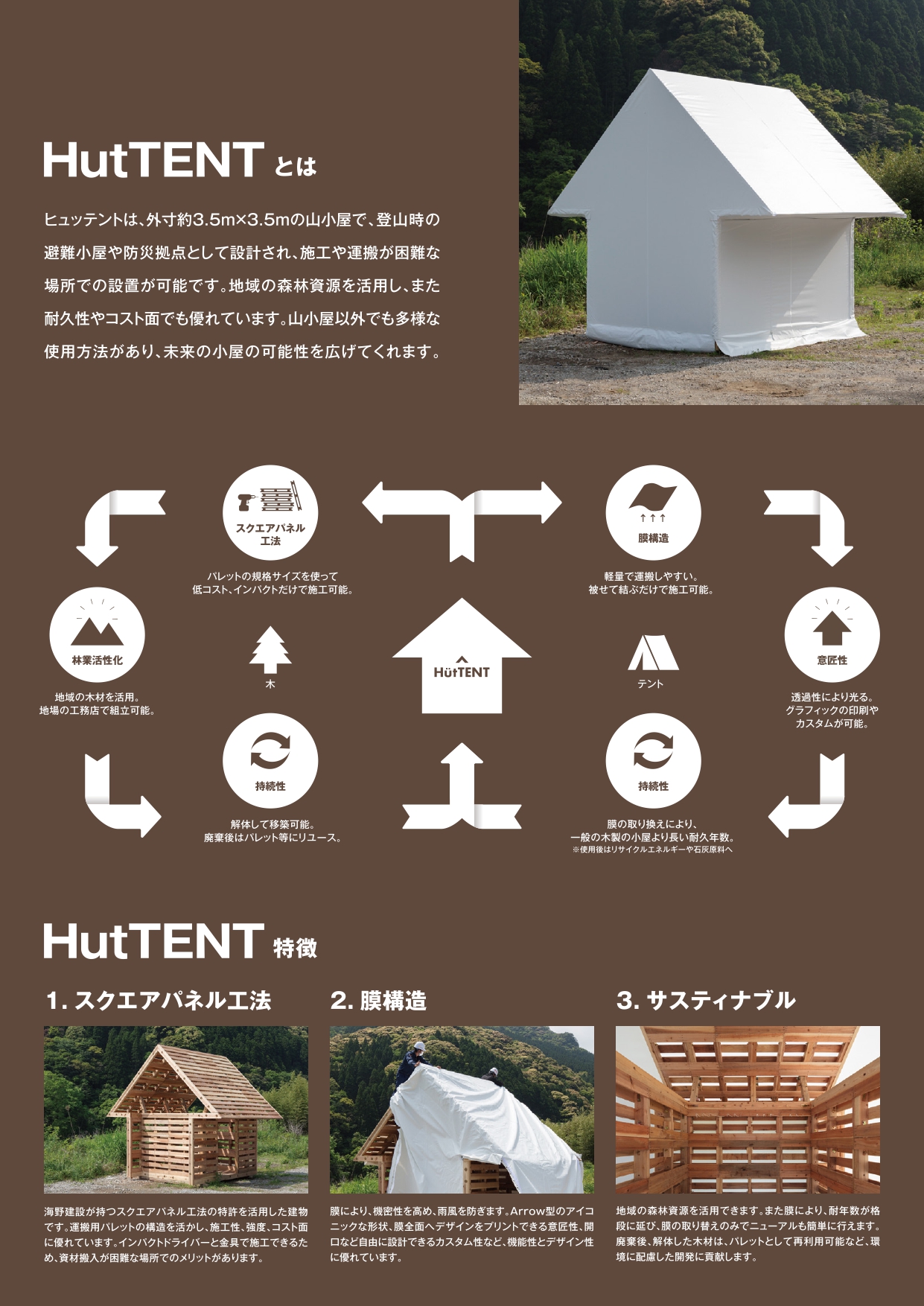 HütTENTは、登山時の避難小屋や防災拠点として設計された山小屋で、施工や運搬が困難な場所でも設置可能な外寸約3.5m✕3.5mのサイズです。このプロジェクトの最大の特徴は、木の循環と膜のメリットを活かしたサスティナブルな小屋である点です。