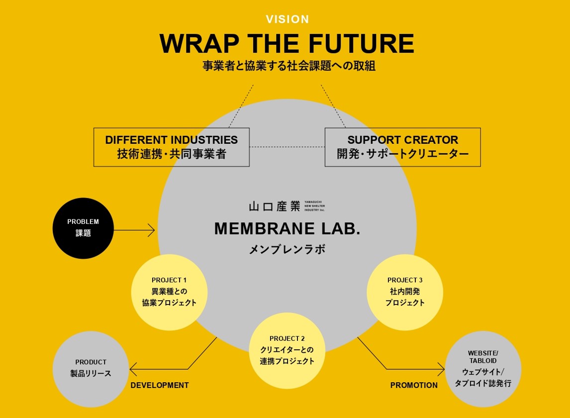 MEMBRANE LAB.は、「WRAP THE FUTURE」というビジョンを掲げ、社外のクリエイターや異業種と協働し、社会や顧客の課題解決に挑む共創ラボであり、実験の場です。