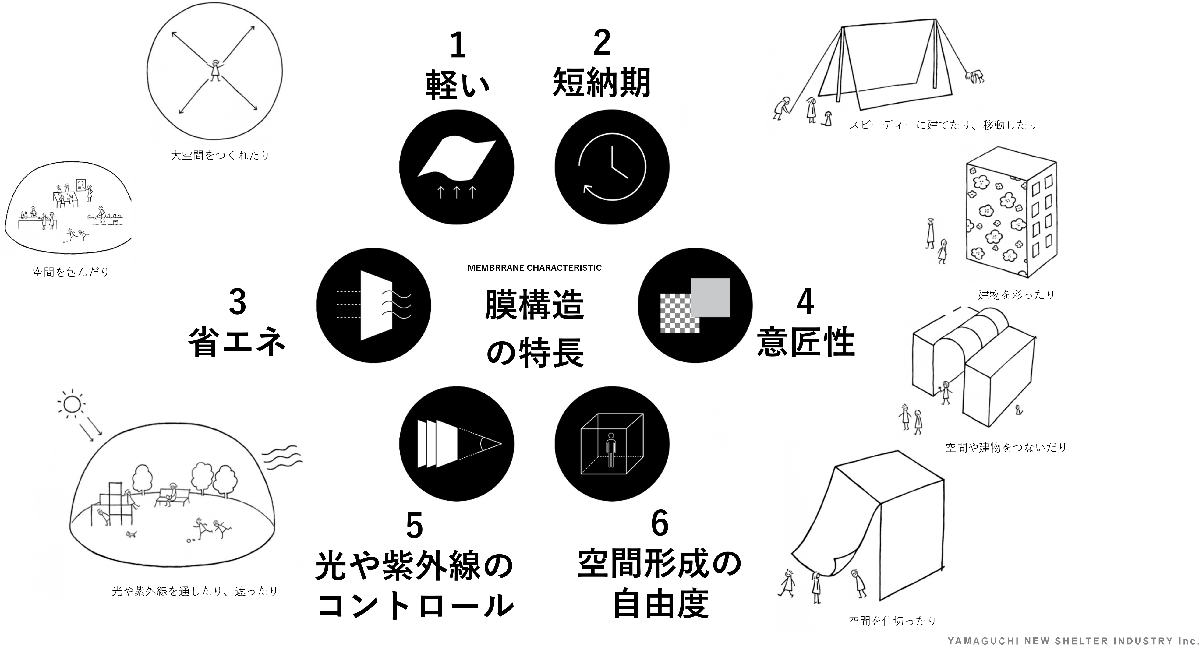 活動の根底には、膜構造が持つ軽量性、短納期、意匠性、光や紫外線のコントロール、大空間をつくれる、空間形成の自由度といった独自の特長(可能性のシーズ)が活かされています。