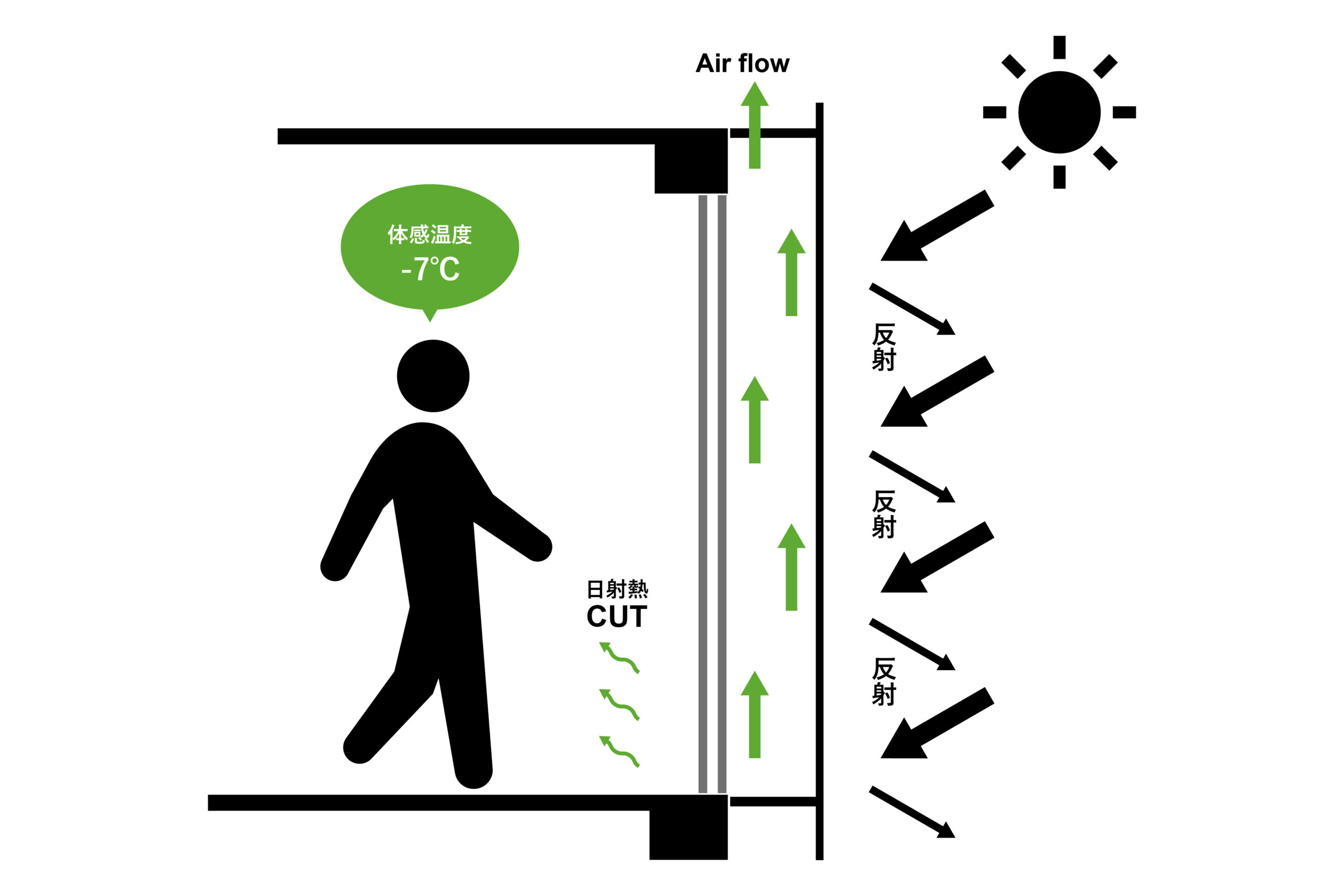 日射を遮蔽し、建物内部の温度上昇を防ぐ機能があります。 夏場の冷房負荷を軽減するために用いられます。 遮熱性能の試験も実施され体感温度を5度下げるという結果も出ています。