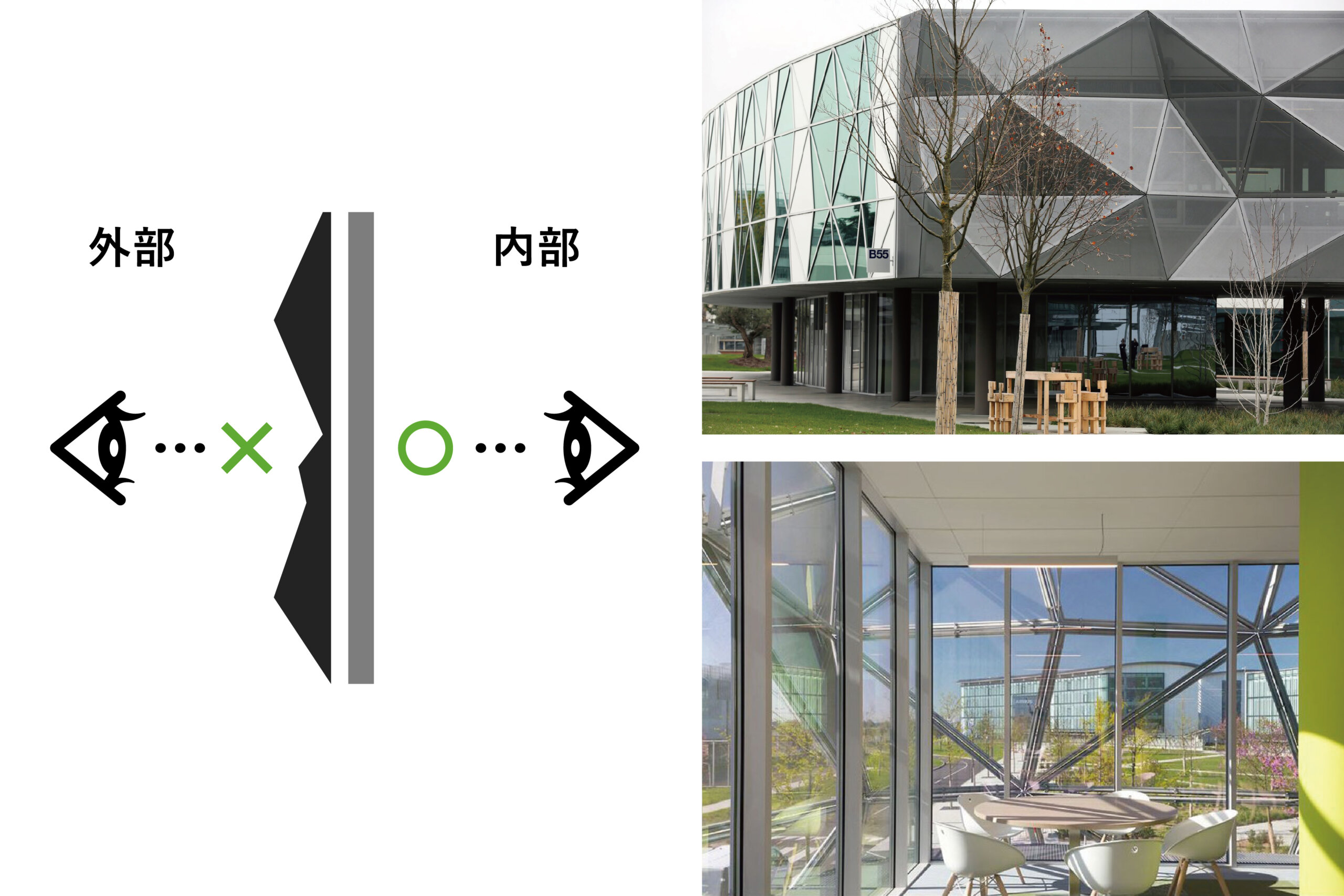 日中は外部からの視線を遮るために用いられます。 建物内部からの視認性は確保されます。