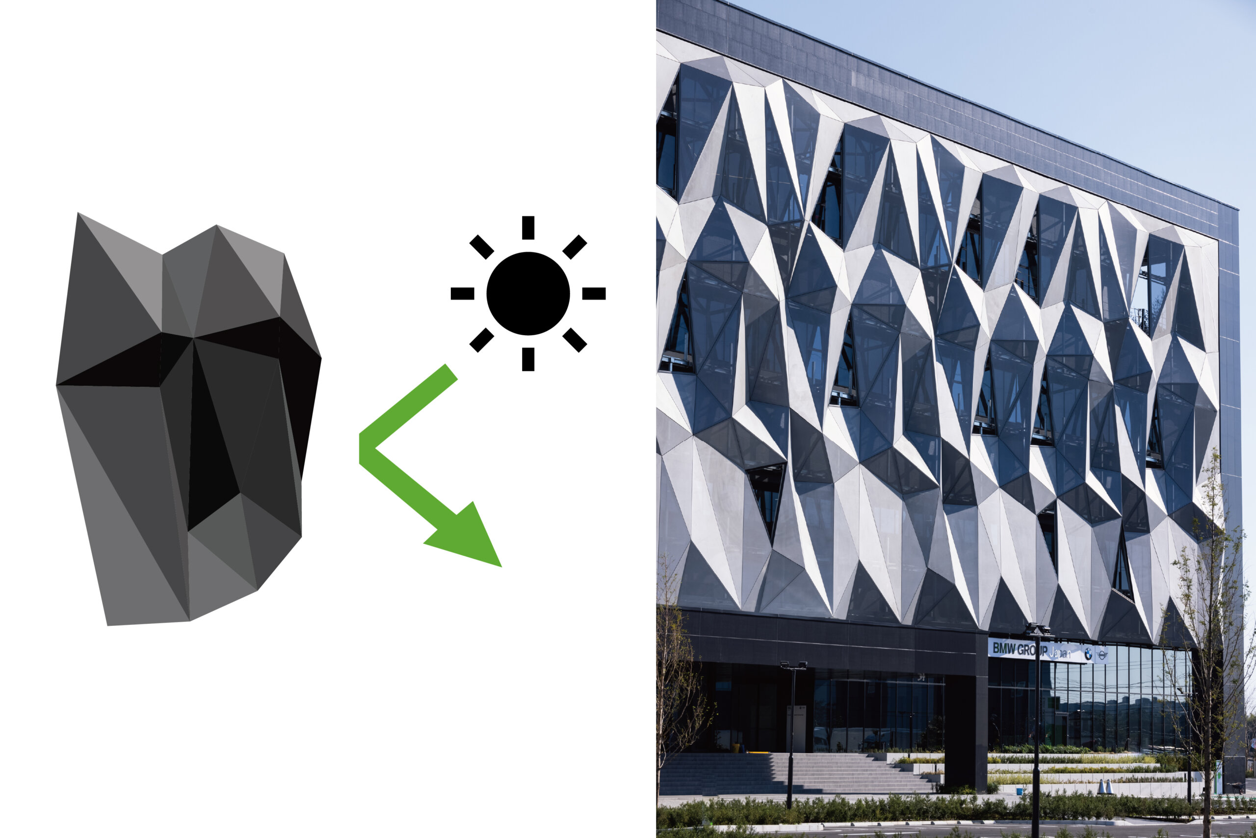 3次元や曲面を活かした視覚的インパクトを創出します。 外からの印象と内からの見え方には違いがあります。 夜間は内部から漏れる光によるライティング演出が可能です。 欧州ではオフィスビルや公共施設で導入が進んでいます。