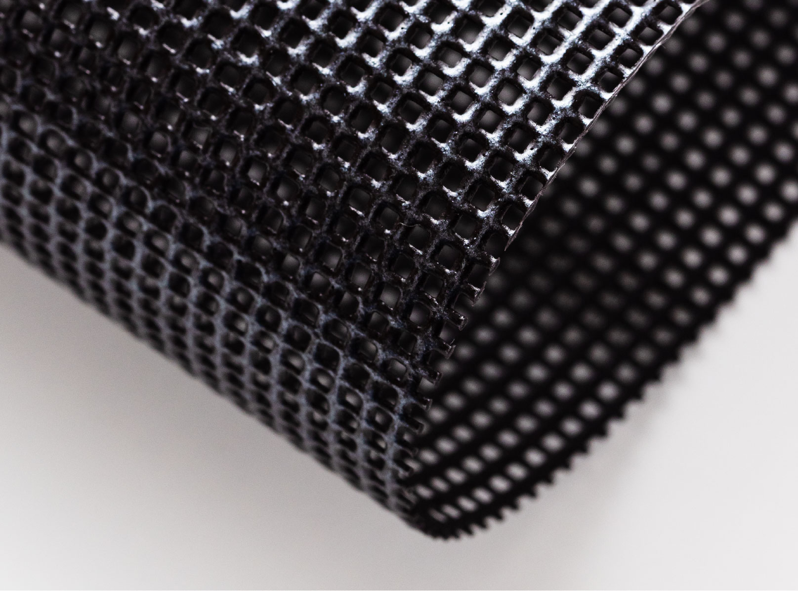 ファブリックファサードには高性能繊維素材をベースとした膜材料が用いられます。ポリエステル繊維またはガラス繊維(Glass Fiber Fabric)を基布(ベースクロス)とし、 その表面にPVC(ポリ塩化ビニル)またはPTFE(四フッ化エチレン樹脂)をコーティングすることで、 耐候性・防汚性・耐火性・寸法安定性を高めることを可能とします。
