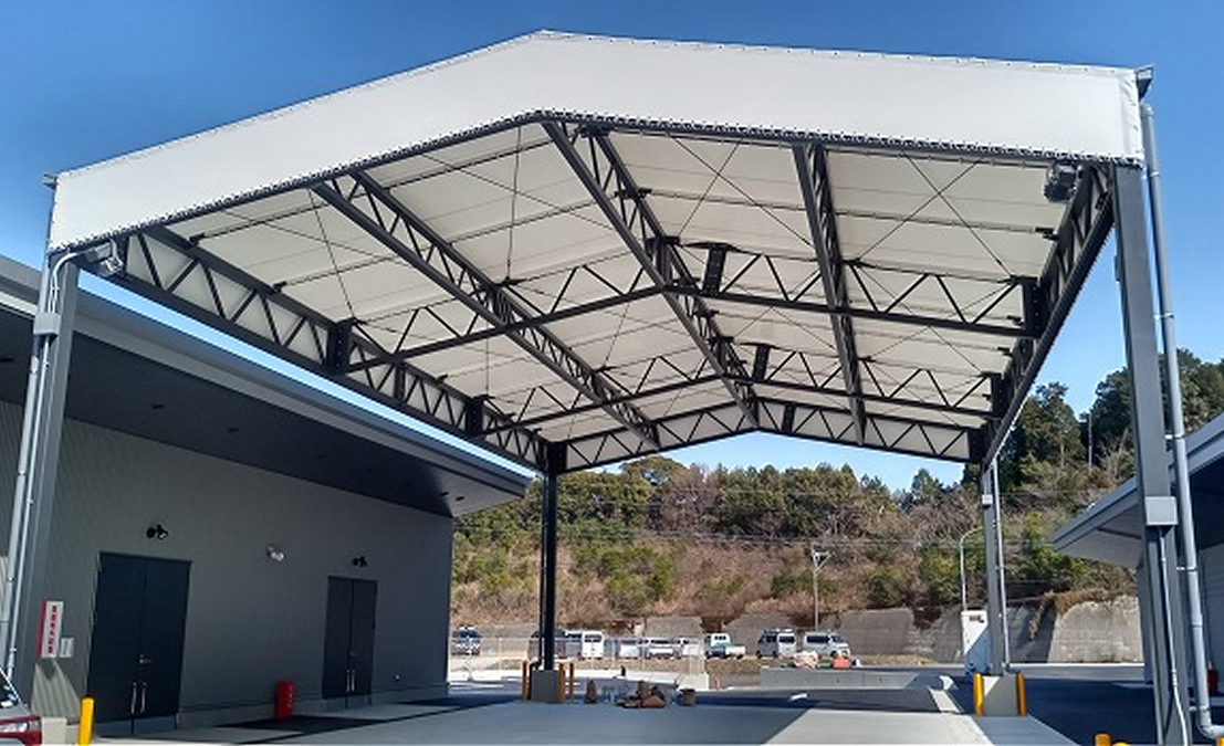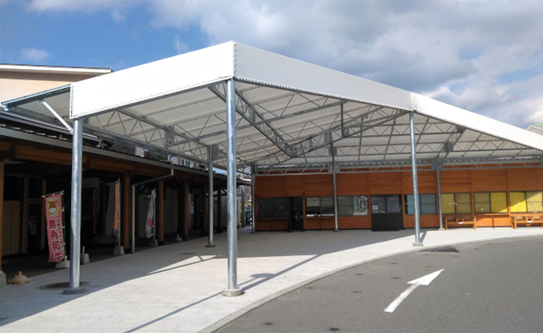 鉄骨のフレームに膜材料(テント生地)を張って作られた屋根のことです。「膜構造建築物」とも呼ばれ、工場の荷捌き場から通路、スポーツ施設まで幅広いシーンで活用されています。