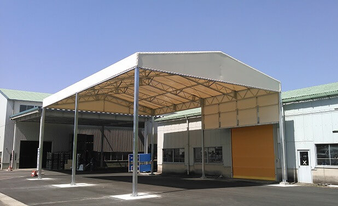 工場や運輸業、農林水産業とあらゆる場所の荷捌き場・一時保管・作業場として利用できます。雨天時や炎天下でも安定して作業を行える「人にやさしいテント空間づくり」が可能です。「堆肥施設の屋根」や「腐葉土の一時置き場」など、特殊な用途にもしっかりと機能を発揮します。
