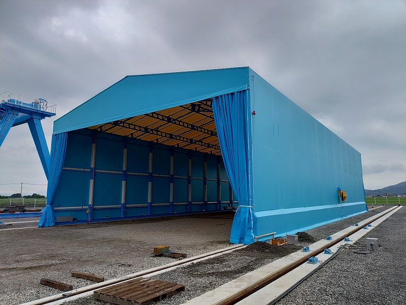 今回の固定移動式テントは、荷捌き場や塗装場など、作業内容に応じて屋根の開閉が必要な現場に最適なソリューションです。